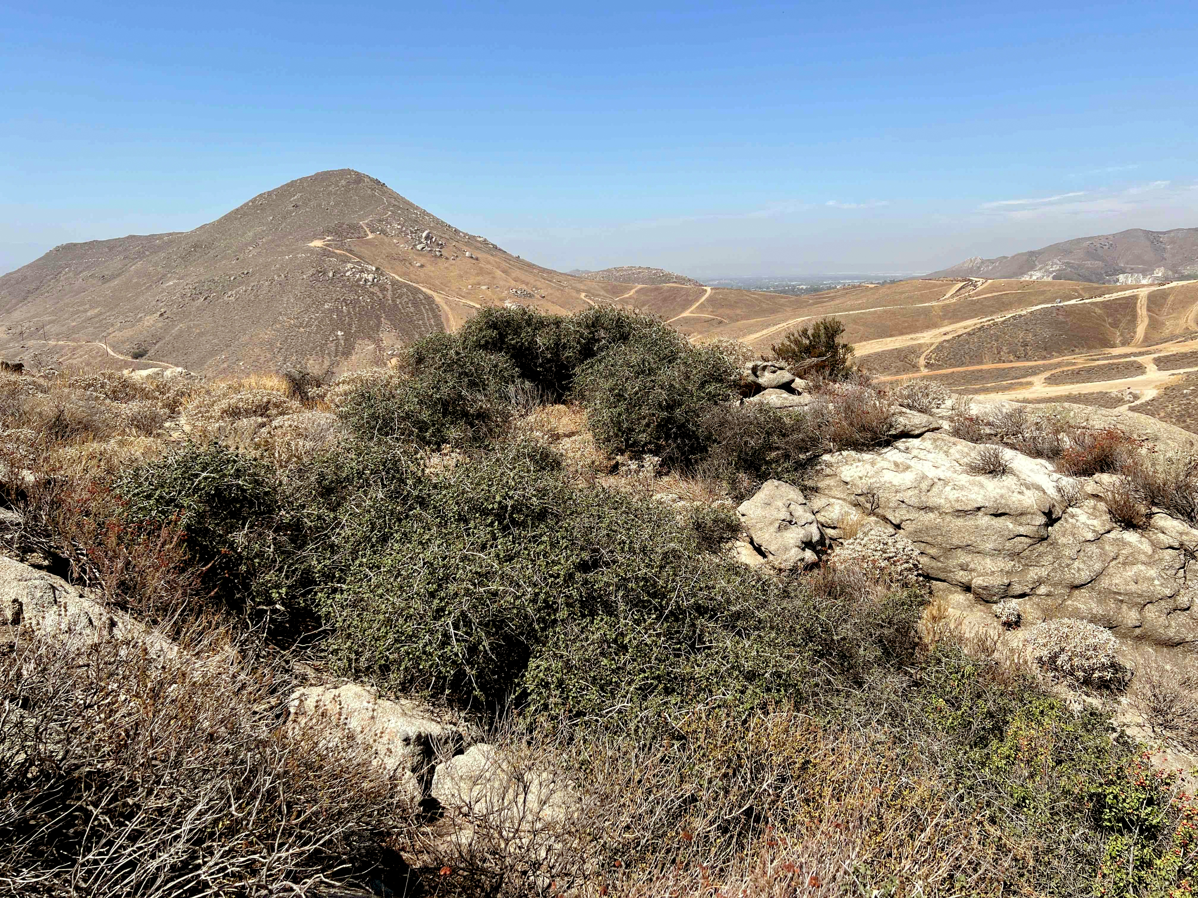 The Hurungna Oak is situated in the Jurupa Mountains, a small mountain range of the Peninsular Ranges that extends east to west across southeastern Pomona Valley. The location of the oak on a west-facing ridgetop is an unusual ecological situation, in that the site is seemingly more xeric and exposed than is preferred by the species. A niche modeling study determined that the site receives less precipitation and higher temperatures than other Palmer’s oak localities, leading the authors to conclude that the site is suboptimal. The apparently anomalous character of the site has prompted speculation that there may be a seep or natural subsurface water catchment basin there that provides water to sustain the Hurungna Oak through dry seasons/periods.