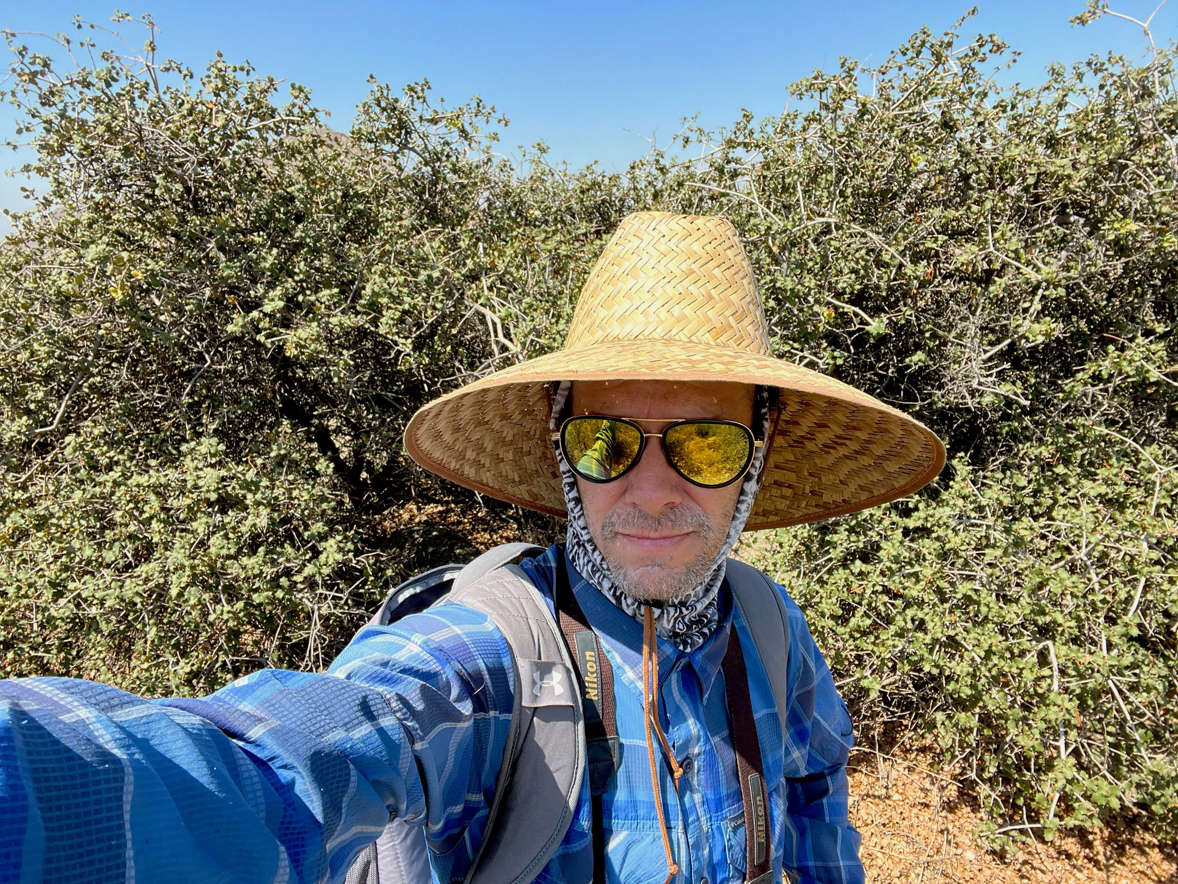 Palmer’s oak is an evergreen shrub or small tree that typically grows to a height of just 2-3 meters. Palmer’s oak is one of the so-called ‘scrub oak’ species – oaks with growth habits that are dense, low, and shrubby rather than the tall and tree-like forms most people imagine oak to be. Like other scrub oaks, Palmer’s oaks can reproduce both asexually through the production of clonal growths and sexually through the production of gametes (sex cells) and seeds (acorns). Some populations of Palmer’s oaks are represented by multiple clonal growths from a single plant.